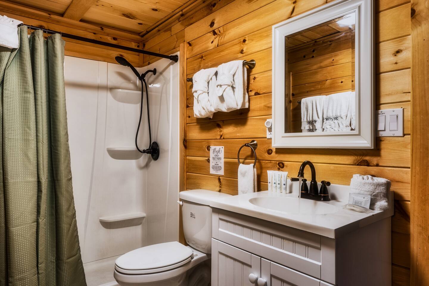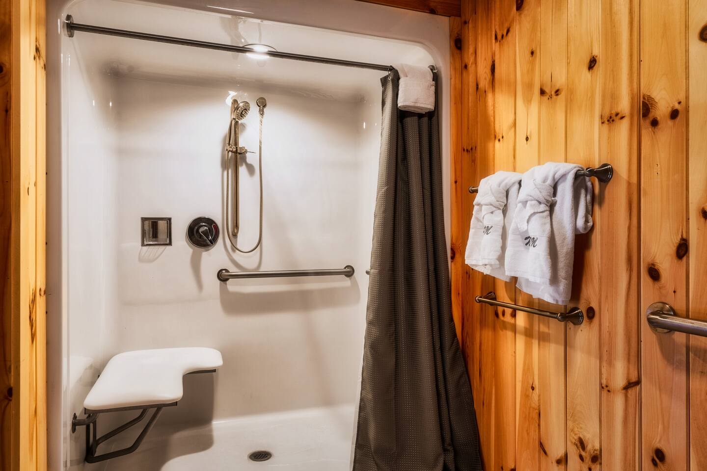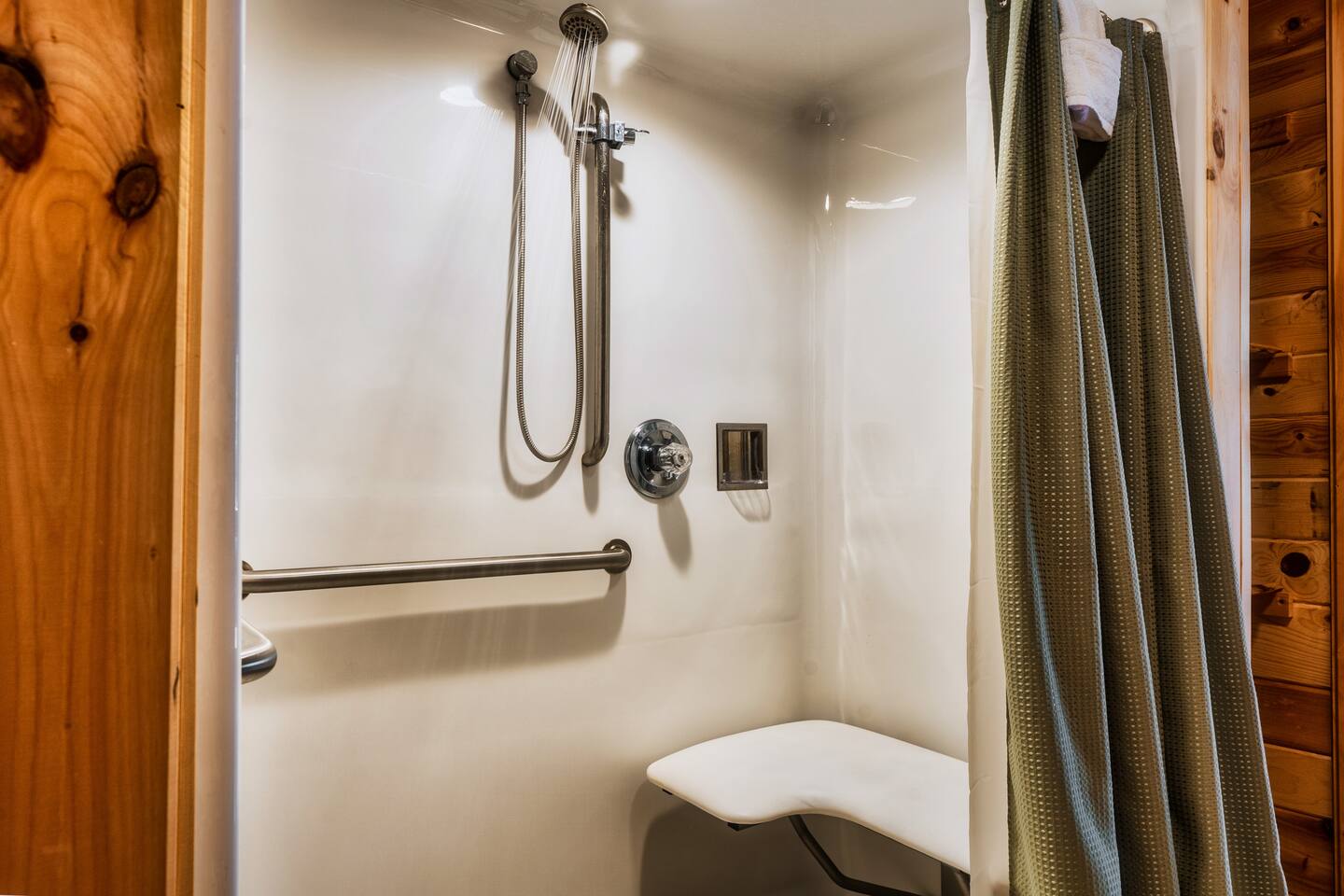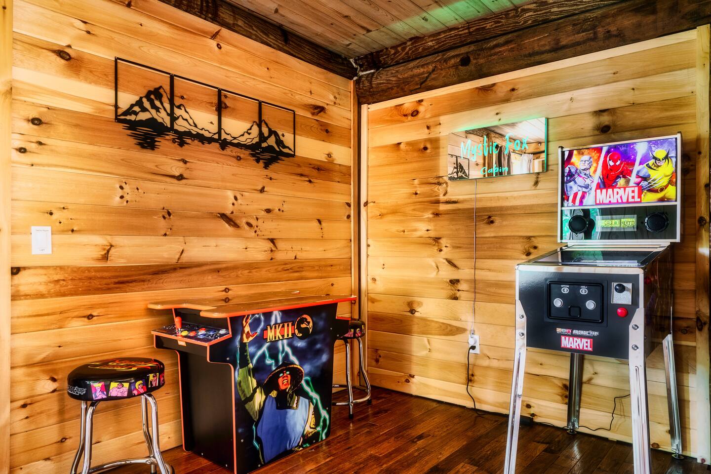 Welcome to Mystic Fox Cabin, your ultimate getaway nestled in the heart of the Smoky Mountains. Designed to offer you a haven of relaxation and accessibility. This spacious retreat is minutes away from Downtown Gatlinburg and provides you with the perfect home base to local attractions such as the Great Smoky Mountain National Park, Dollywood and Pigeon Forge. This 3,168 SF 4-bedroom 3-bathroom real log cabin has (2) levels and offers (2) step-free and wheelchair accessible entrances (32+" and 60+" wide) on the main level. Main Level: The main level is fully wheelchair accessible with an open-concept kitchen, living and dining area. You will also find a game/arcade room, theater room, laundry room, a large, enclosed porch with an exterior deck that houses a private hot tub with seasonal mountain views. The main level will have (2) wheelchair accessible King Suites which feature roll-in showers and shower seats with a 5-foot turning radius in both bathrooms and grab bars for the showers and toilets. The sinks are located outside the bathrooms for easy roll-under access and space. All doorways on the main level are 32" or wider. Lower Level: The lower level features a King Bedroom and a large sleeping area that share a full bathroom with shower. You will also find a second enclosed porch with a comfortable recliner and an outdoor patio with a 2-person egg chair. ★ Living Room ★ • Comfortable Sectional Couch with pillows. • Wood Burning Fireplace. • 50" Roku Smart TV. Please bring your login information. • Coffee tables and reading lamps. ★ Kitchen & Dining ★ • Wheelchair accessible appliances - Stove, Oven, Microwave, Dishwasher, Refrigerator • French Door Refrigerator with Water and Ice Dispenser • Butcher block counter tops with large island • Keurig K-Cup and Carafe Coffee Maker • French Press • Stove top Espresso Maker • Stove top Tea Kettle • Crockpot • Electric Hand Mixer • Flip Belgium Waffle Maker • Toaster • Blender • Cookware, Bakeware, Dinnerware, Glassware, Silverware, & Food Storage Container Sets • Large dining table that seats 8 people. • 3-seat breakfast bar adjacent to the island. • 2-seat dining nook overlooking seasonal mountain views. • Workspace at the Breakfast bar. ★ Sleeping Arrangements – 4 Bedrooms ★ ♛ Bedroom 1 – King Bed (sleeps 2) ♛ Bedroom 2 – King Bed (sleeps 2) ♛ Bedroom 3 – King Bed (sleeps 2) ♛ Bedroom 4 – Queen Bunk Beds (sleeps 4) , (1) Twin Bunk Bed (sleeps 1) with Futon (sleeps 1) underneath ★ All bedrooms offer a similar set of amenities and furnishing: • Smart TV with streaming apps. Please bring your login information. • Pillows, Linens, Sheets, Feather Down Comforter and Extra Blankets. • Night Stands with Reading Lamps. ★ All (3) Bathrooms ★ • Bath with a Shower • Vanity • Toilet • Towels • Wash Cloths • Hair Dryer • Starter Pack Essential Toiletries - Shampoo, Conditioner, Body Wash, Hand Wash ★ Theater Room ★ • 65" Roku Smart TV. Please bring your login information. • 4 theater seats • 2 bean bag chairs ★ Game/Arcade Room ★ • Atari and Galaga Stand-up Arcade Machines (60+ Atari Games - calling all Atari fans!) • Seated 2-plater Mortal Combat Arcade Game • Marvel Pinball Machine • 4-seat game table with an assortment of boards and card games ★ Outdoor Deck ★ • 5-person Private Hot Tub • 2 outdoor chairs ★ Outdoor Area ★ • Park Charcoal Grill & Utensils • Picnic Table • 2 outdoor chairs • Cornhole • 2-person Egg Chair ★ Other Amenities ★ • High-Speed Wi-Fi (300 Mbps!) • Air Conditioning/Heat • Laundry Room with Washer/Dryer • Parking - Paved driveway accommodates up to 4 vehicles