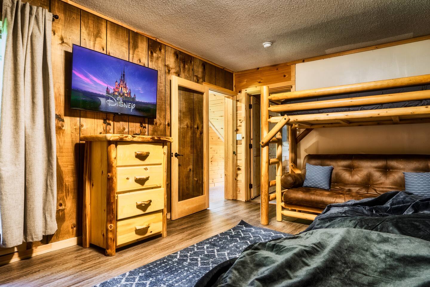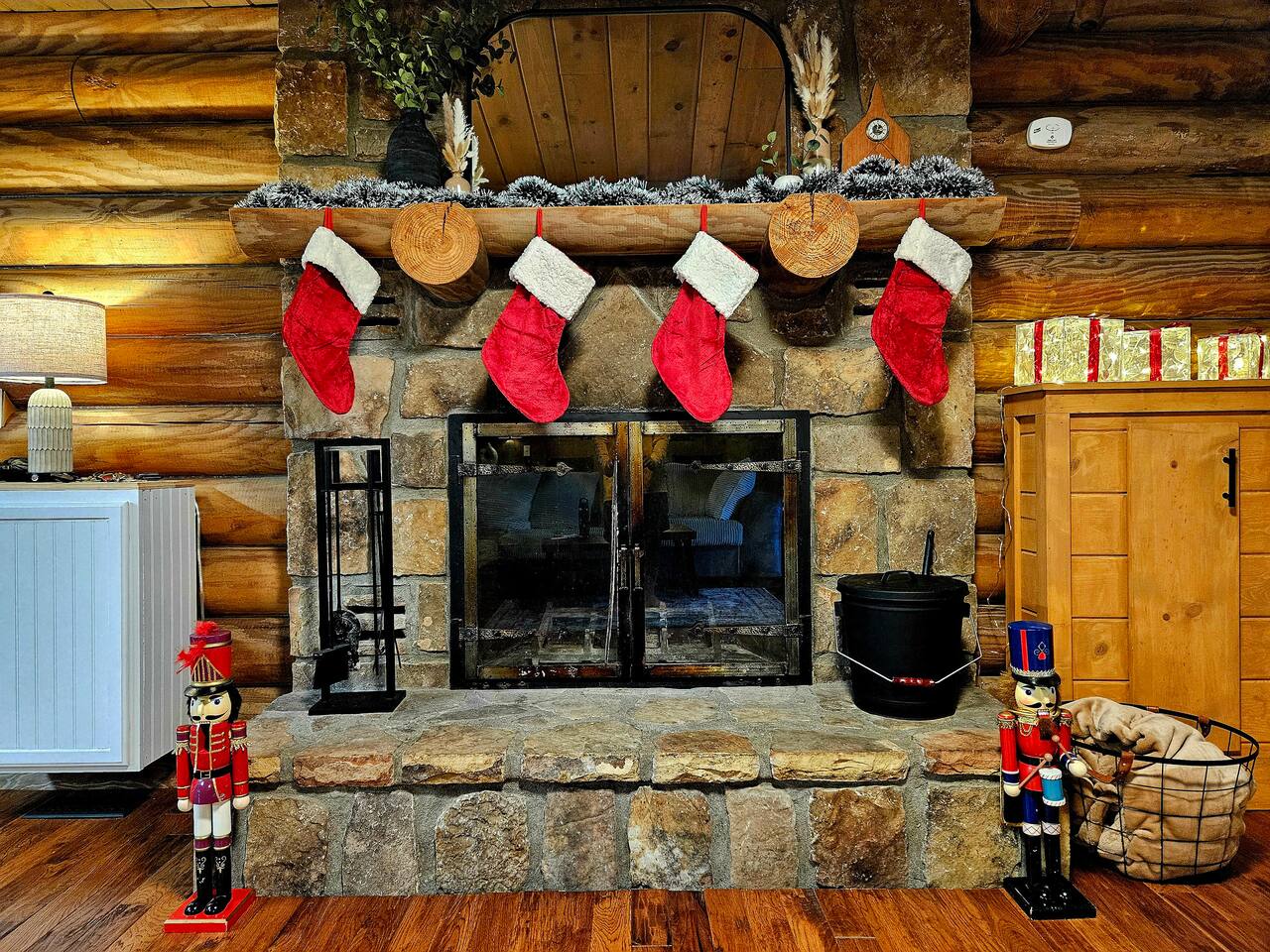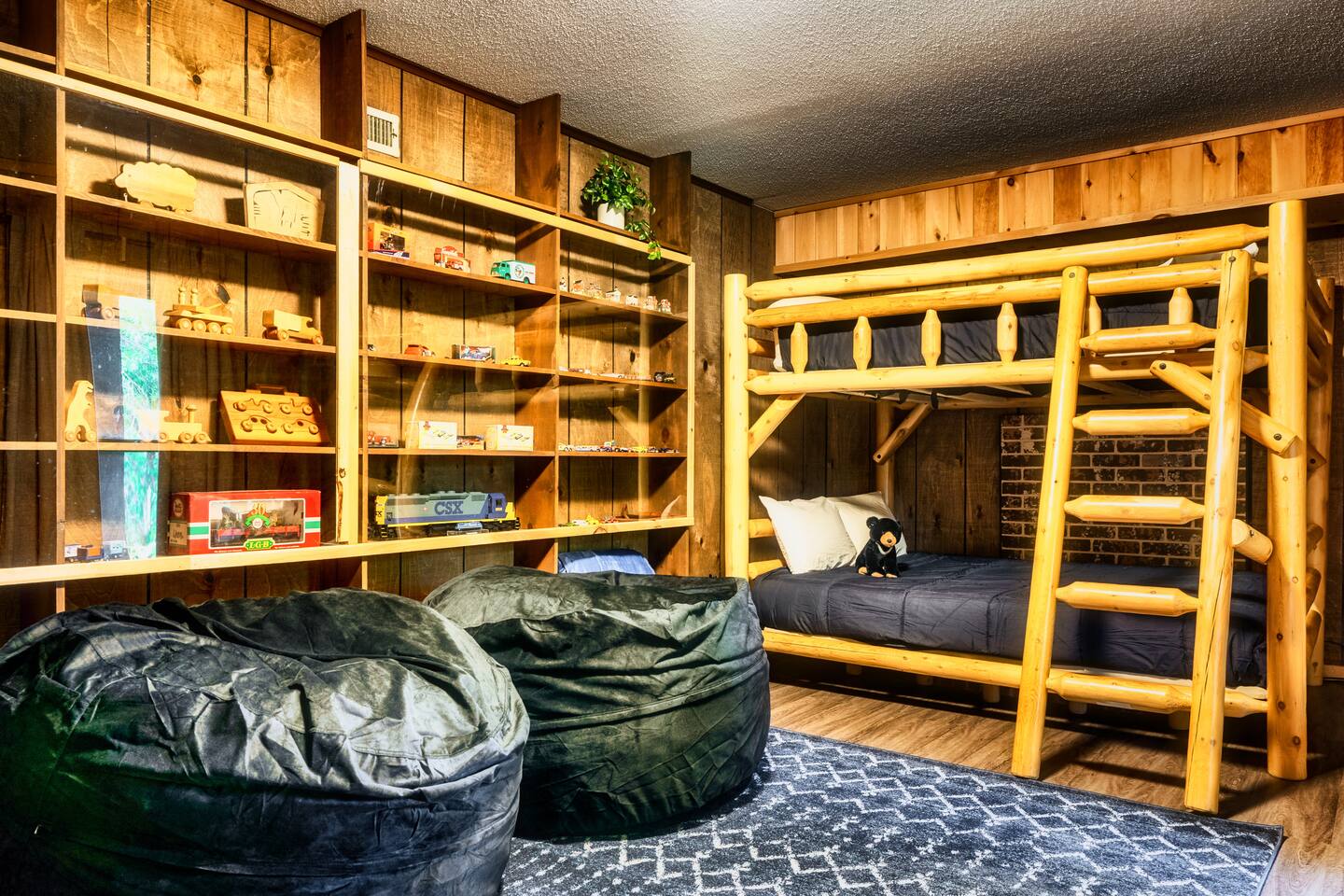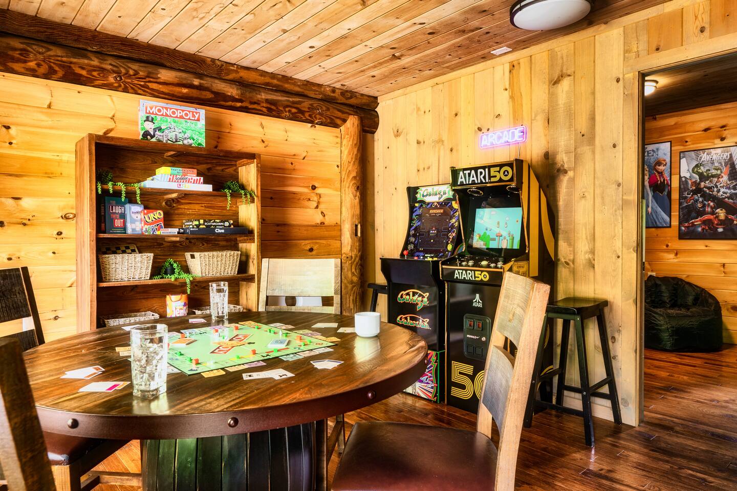 Welcome to Mystic Fox Cabin, your ultimate getaway nestled in the heart of the Smoky Mountains. Designed to offer you a haven of relaxation and accessibility. This spacious retreat is minutes away from Downtown Gatlinburg and provides you with the perfect home base to local attractions such as the Great Smoky Mountain National Park, Dollywood and Pigeon Forge. This 3,168 SF 4-bedroom 3-bathroom real log cabin has (2) levels and offers (2) step-free and wheelchair accessible entrances (32+" and 60+" wide) on the main level. Main Level: The main level is fully wheelchair accessible with an open-concept kitchen, living and dining area. You will also find a game/arcade room, theater room, laundry room, a large, enclosed porch with an exterior deck that houses a private hot tub with seasonal mountain views. The main level will have (2) wheelchair accessible King Suites which feature roll-in showers and shower seats with a 5-foot turning radius in both bathrooms and grab bars for the showers and toilets. The sinks are located outside the bathrooms for easy roll-under access and space. All doorways on the main level are 32" or wider. Lower Level: The lower level features a King Bedroom and a large sleeping area that share a full bathroom with shower. You will also find a second enclosed porch with a comfortable recliner and an outdoor patio with a 2-person egg chair. ★ Living Room ★ • Comfortable Sectional Couch with pillows. • Wood Burning Fireplace. • 50" Roku Smart TV. Please bring your login information. • Coffee tables and reading lamps. ★ Kitchen & Dining ★ • Wheelchair accessible appliances - Stove, Oven, Microwave, Dishwasher, Refrigerator • French Door Refrigerator with Water and Ice Dispenser • Butcher block counter tops with large island • Keurig K-Cup and Carafe Coffee Maker • French Press • Stove top Espresso Maker • Stove top Tea Kettle • Crockpot • Electric Hand Mixer • Flip Belgium Waffle Maker • Toaster • Blender • Cookware, Bakeware, Dinnerware, Glassware, Silverware, & Food Storage Container Sets • Large dining table that seats 8 people. • 3-seat breakfast bar adjacent to the island. • 2-seat dining nook overlooking seasonal mountain views. • Workspace at the Breakfast bar. ★ Sleeping Arrangements – 4 Bedrooms ★ ♛ Bedroom 1 – King Bed (sleeps 2) ♛ Bedroom 2 – King Bed (sleeps 2) ♛ Bedroom 3 – King Bed (sleeps 2) ♛ Bedroom 4 – Queen Bunk Beds (sleeps 4) , (1) Twin Bunk Bed (sleeps 1) with Futon (sleeps 1) underneath ★ All bedrooms offer a similar set of amenities and furnishing: • Smart TV with streaming apps. Please bring your login information. • Pillows, Linens, Sheets, Feather Down Comforter and Extra Blankets. • Night Stands with Reading Lamps. ★ All (3) Bathrooms ★ • Bath with a Shower • Vanity • Toilet • Towels • Wash Cloths • Hair Dryer • Starter Pack Essential Toiletries - Shampoo, Conditioner, Body Wash, Hand Wash ★ Theater Room ★ • 65" Roku Smart TV. Please bring your login information. • 4 theater seats • 2 bean bag chairs ★ Game/Arcade Room ★ • Atari and Galaga Stand-up Arcade Machines (60+ Atari Games - calling all Atari fans!) • Seated 2-plater Mortal Combat Arcade Game • Marvel Pinball Machine • 4-seat game table with an assortment of boards and card games ★ Outdoor Deck ★ • 5-person Private Hot Tub • 2 outdoor chairs ★ Outdoor Area ★ • Park Charcoal Grill & Utensils • Picnic Table • 2 outdoor chairs • Cornhole • 2-person Egg Chair ★ Other Amenities ★ • High-Speed Wi-Fi (300 Mbps!) • Air Conditioning/Heat • Laundry Room with Washer/Dryer • Parking - Paved driveway accommodates up to 4 vehicles